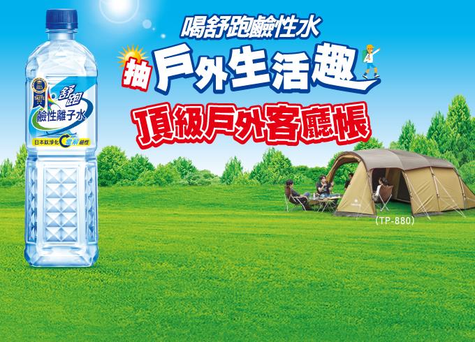 抽獎資格:活動時間內於指定通路購買外箱標示『抽頂級戶外客廳帳』之舒跑鹼性離子水850ml整箱,每箱內附刮刮卡一張,有機會刮中Snow Peak頂級戶外客廳帳、竹折桌、休閒椅!在戶外補充水分還有好康拿唷!