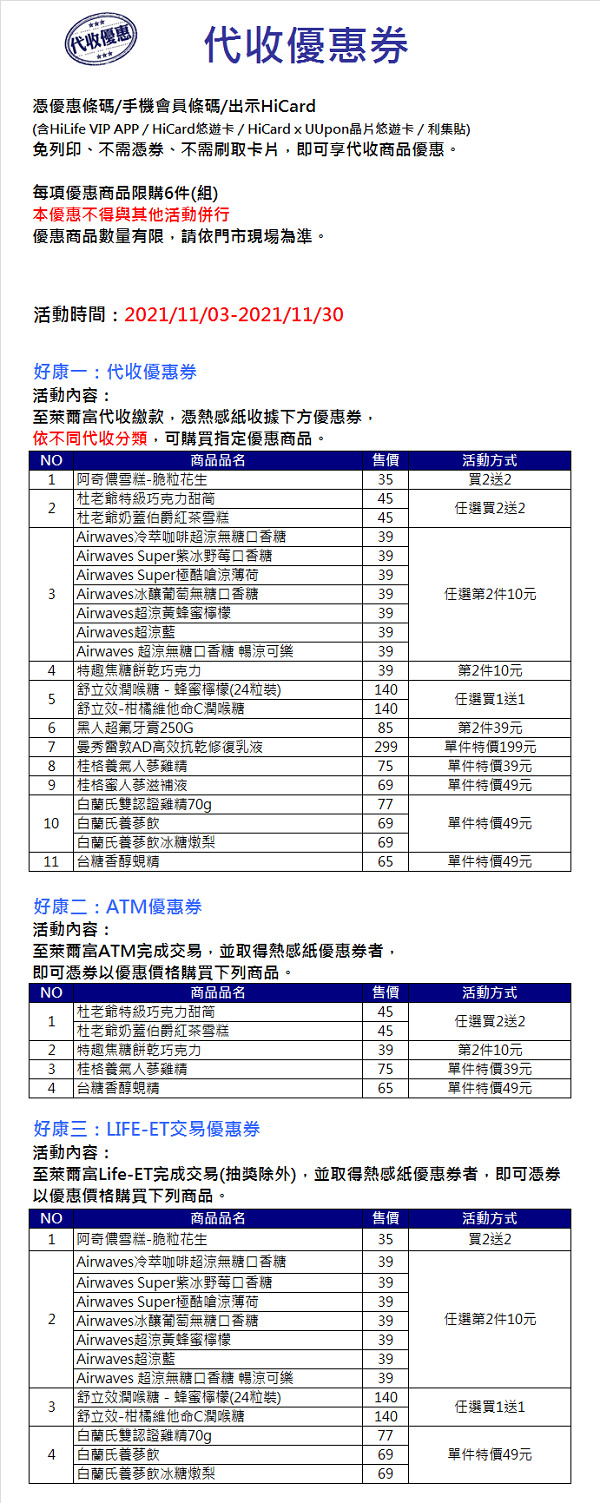 憑優惠條碼/手機會員條碼/出示HiCard(含Hilife VIP APP、HiCard悠遊卡、HiCard x UUpon晶片悠遊卡、利集貼)