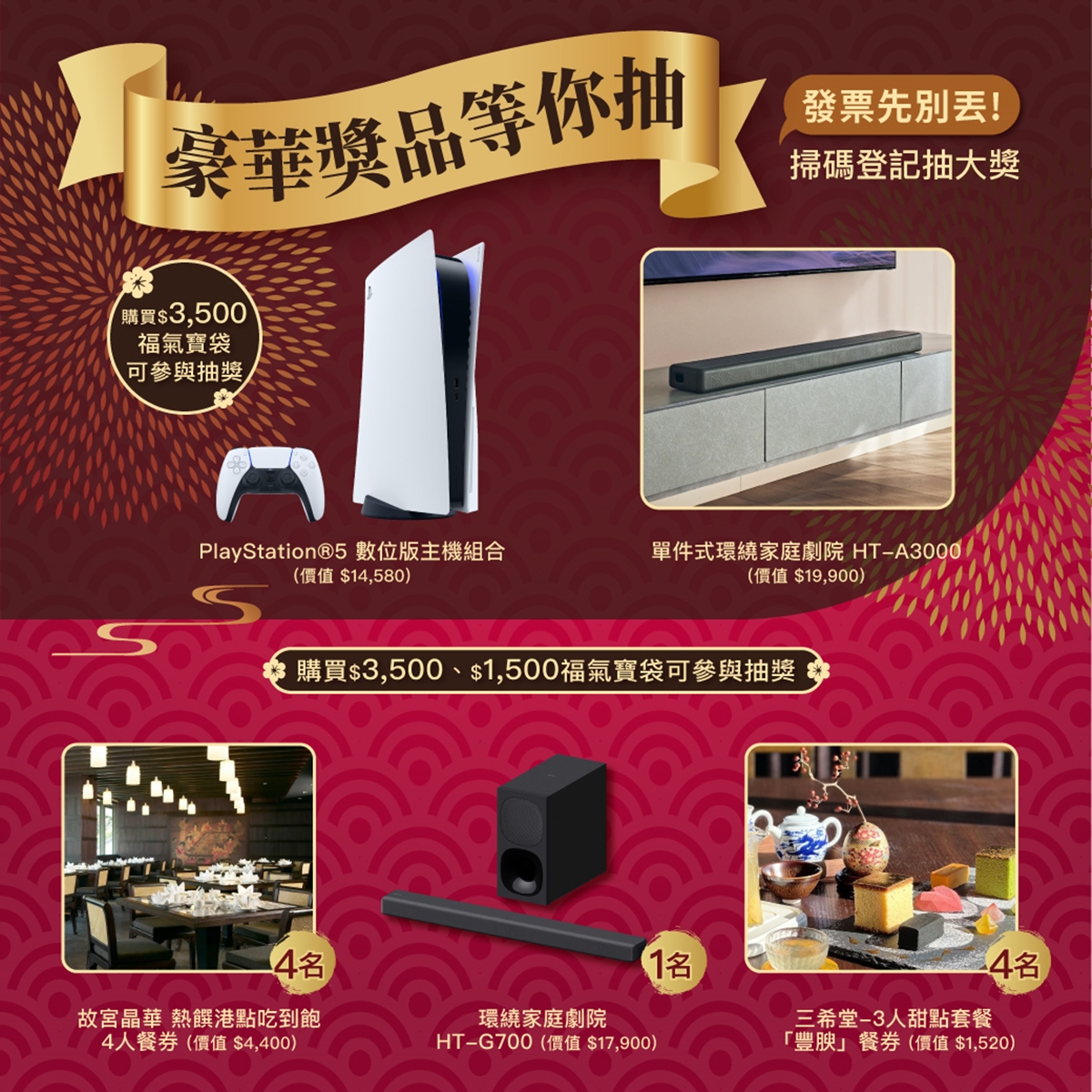 購買$3,500元福袋可參與抽獎全數獎項,購買$1,500元福袋可參與抽獎部分獎項(故宮晶華熱饌港點吃到飽4人餐券、環繞家庭劇院HT-G700、三希堂-3人甜點套餐「豐腴」餐券)
