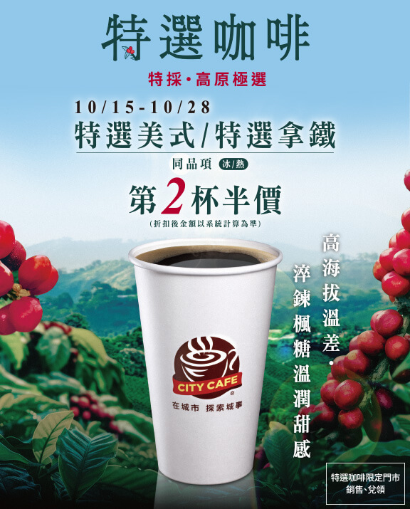 CITY CAFE 特選咖啡!特選美式/特選拿鐵 同品項(冰/熱)第2杯半價